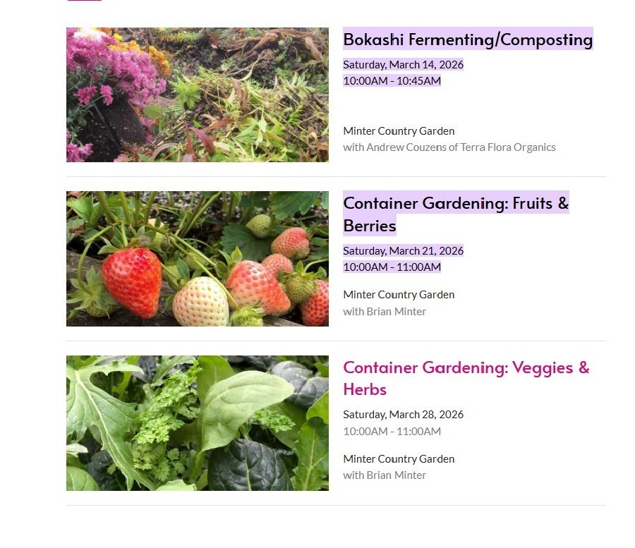 The following three presentations will take place at the Minter Country Garden (10015 Young Rd, Chilliwack). Our Branch will not be organizing a group event this year, but last year many members enjoyed a presentation by Brian Minter and a delicious lunch at the Cultivate Cafe. With that in mind Helen Morrison suggested we advise our members of what is happening at Minters this Spring. Why not join up with other members and car pool for a nice drive to the country, listen to a very interesting and entertaining presentation, and have lunch at the Cafe before heading home. These presentations are free but registration is required. Helen brought these events to our attention and would gladly take your information and register for you. Please contact Helen at 778 223-9518 for registration and further information. Or, contact Minter Gardens at 1 800 661-3919.